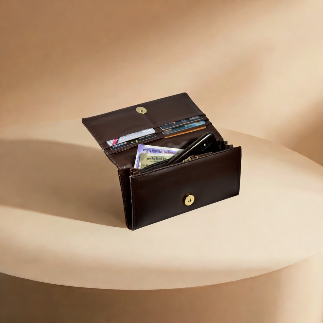 Designed with 10 spacious card slots, it keeps your essentials neatly organized while providing ample space for cash, coins, and small valuables. The secure closure ensures your belongings stay safe, while the slim profile makes it easy to slip into your handbag.